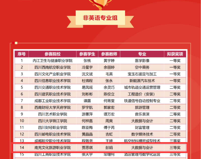 我校基础教学部英语专任教师彭娟老师和经管系22级大数据与会计2班贾思琪同学组成团队,师生同赛。在比赛中,与来自56所高职院校团队同台竞技,经过一轮又一轮的比拼,过关斩将,冲进决赛,最终凭借沉着冷静的发挥、流利的口语,获得三等奖!